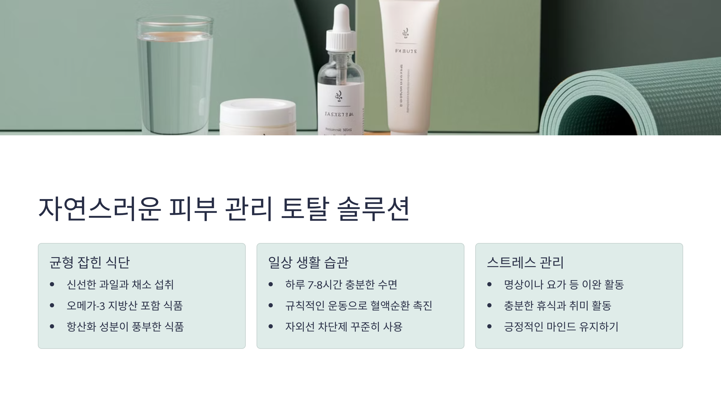 | 자외선 차단 | 아무리 좋은 영양제를 먹어도 자외선 관리를 안 하면 효과가 반감돼요. 선크림 필수! |