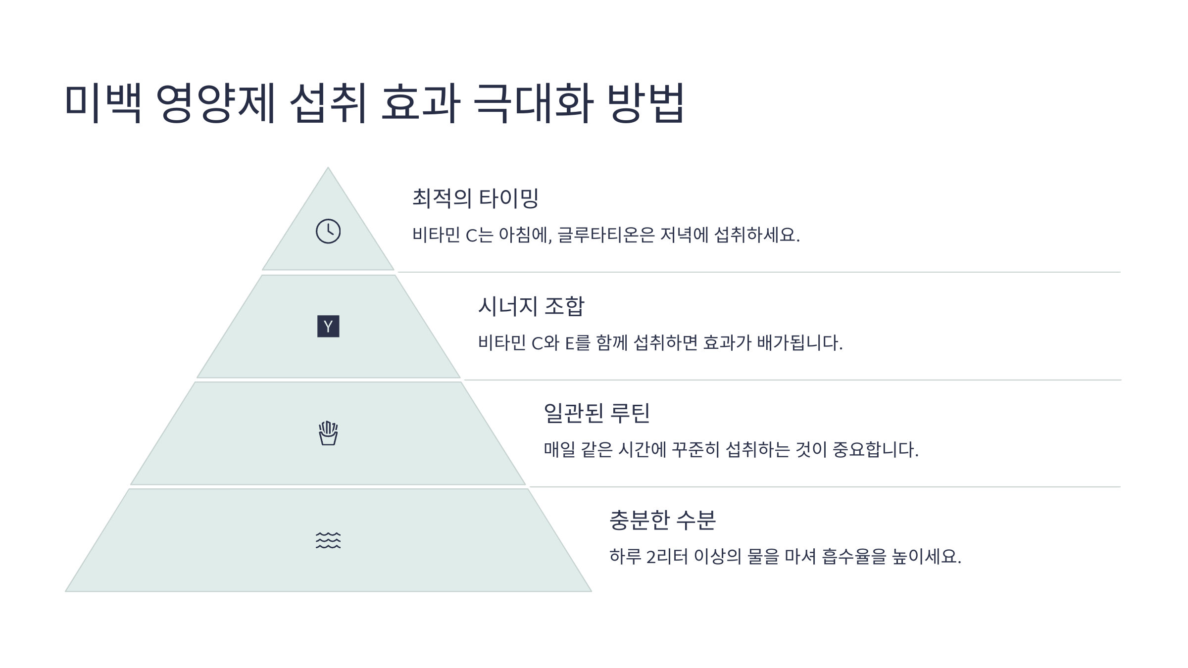 영양제를 먹는다고 해서 무조건 효과가 극대화되는 것은 아니에요! 올바른 복용 방법과 함께 흡수율을 높이는 습관을 들이면 미백 효과를 더욱 빠르게 볼 수 있답니다. 🌟