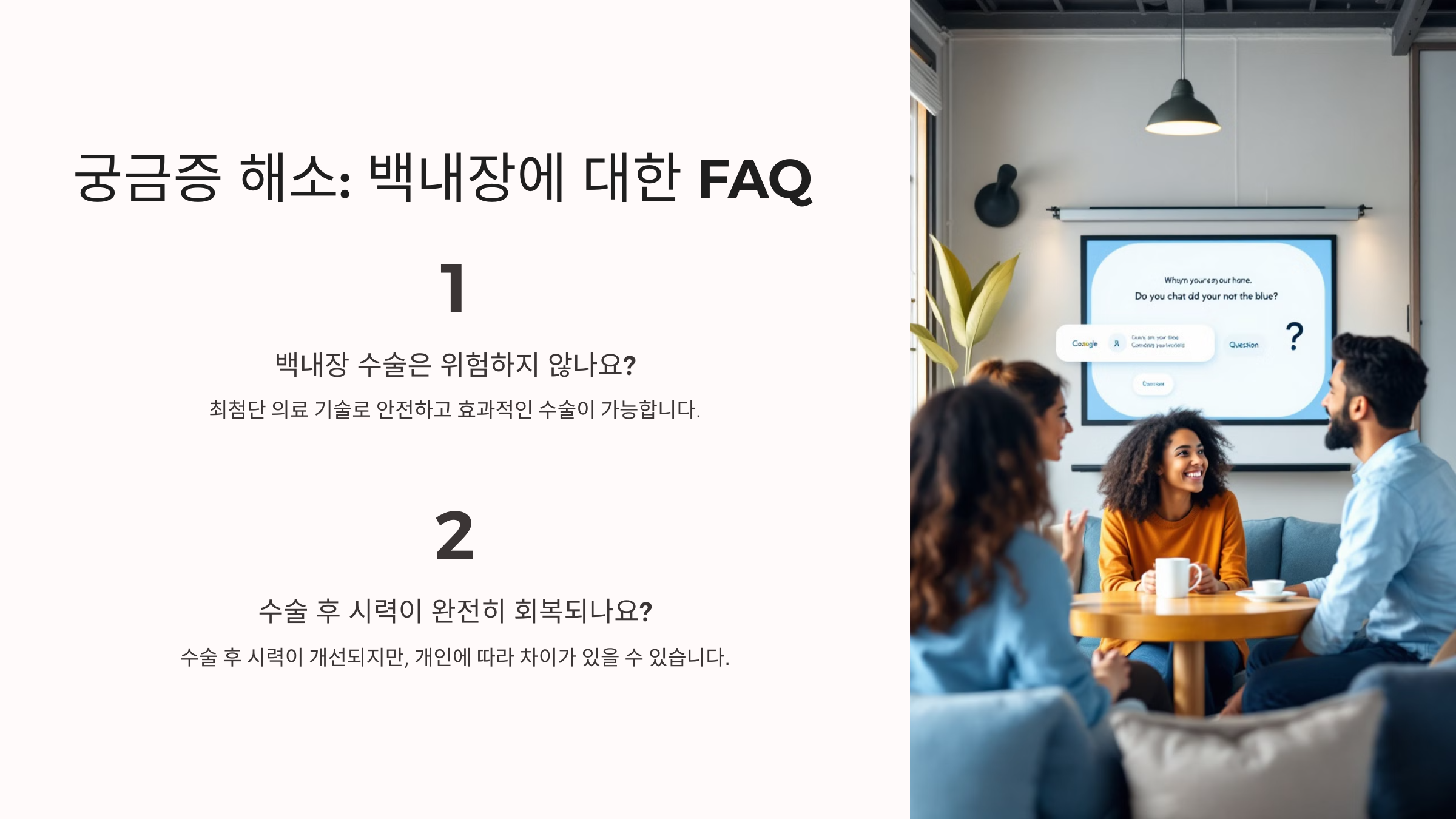 백내장 수술은 비교적 안전한 편이며, 짧은 시간 내에 시력을 회복할 수 있어요. 하지만 수술 후 관리도 중요하기 때문에 주의사항을 잘 지켜야 해요!