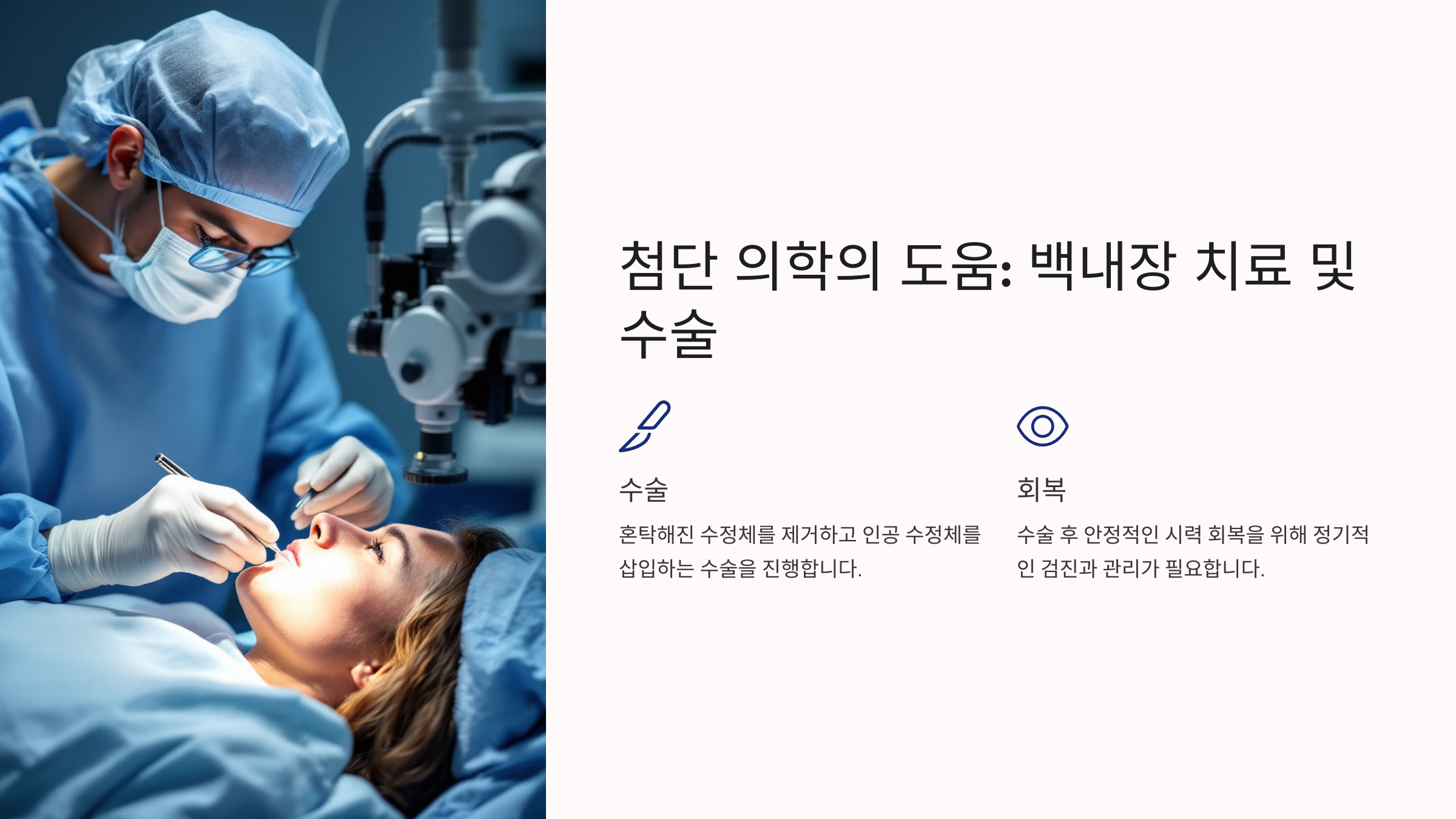 🔹 수술 치료 – 혼탁해진 수정체를 제거하고 인공수정체를 삽입하는 방식
