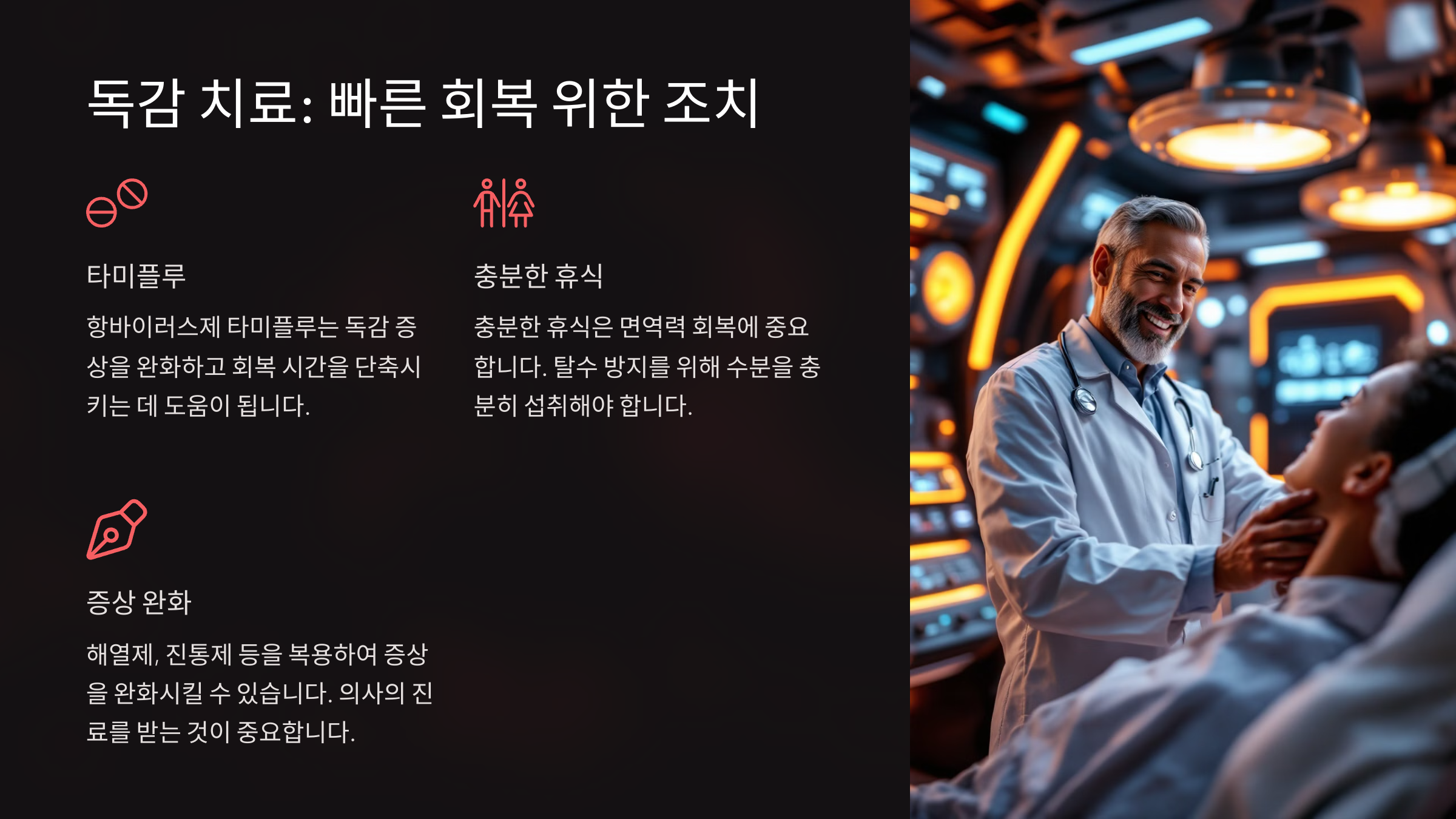 독감 치료는 주로 증상 완화를 목표로 해요. 타이레놀과 같은 해열제를 사용해 발열과 통증을 완화할 수 있고, 수분을 충분히 섭취하며 휴식을 취하는 것이 중요해요. 심각한 경우에는 의사의 처방을 통해 항바이러스제를 복용할 수도 있어요.
