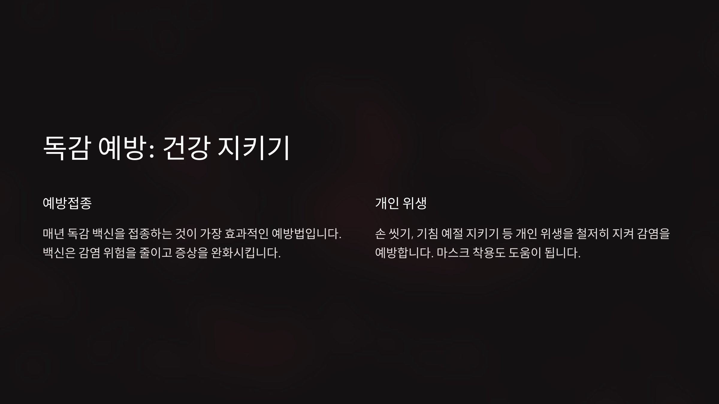 예방 접종은 독감 예방의 가장 효과적인 방법 중 하나로 알려져 있어요. 예방 접종 외에도 손 씻기, 적정 거리 유지, 균형 잡힌 식사 등 개인위생 관리가 필수적이에요. 나의 생각으로는, 독감의 심각성을 인지하고 예방을 위한 습관을 꾸준히 실천하는 것이 무엇보다 중요하다고 느껴져요.