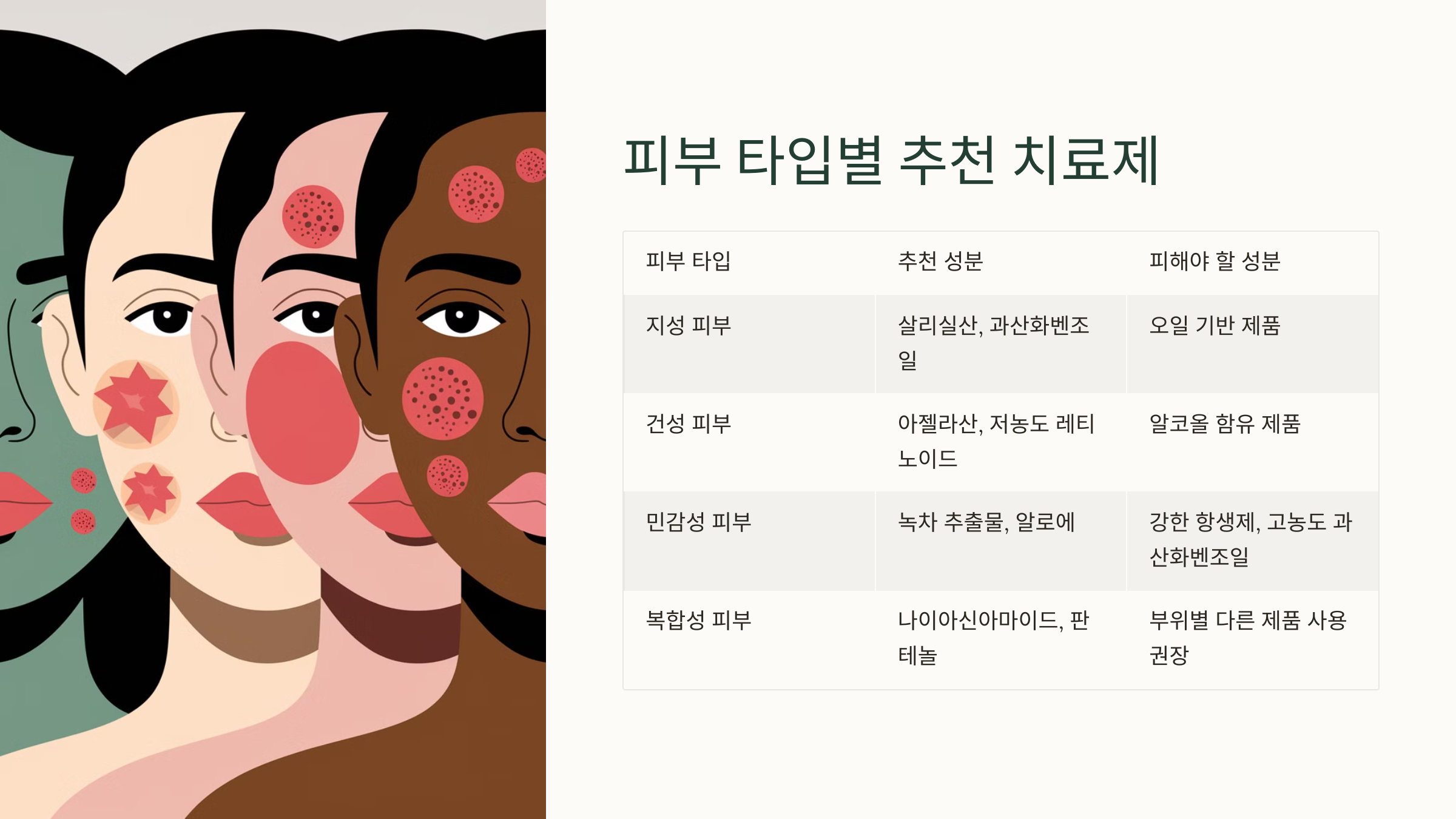 | 피부 타입 | 추천 성분 | 피해야 할 성분 |
