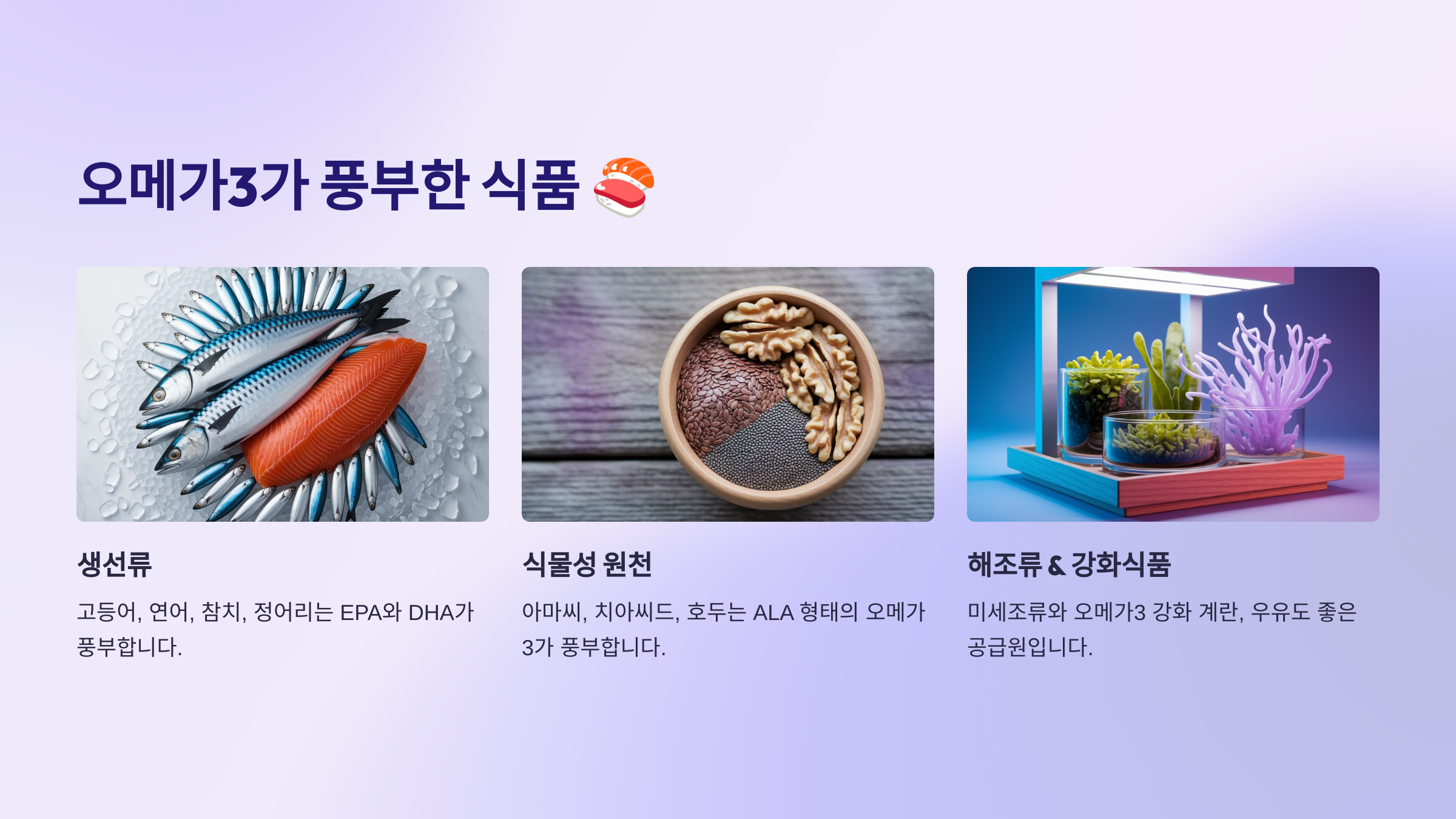 | 연어 | EPA, DHA | 가장 대표적인 오메가3 공급원 |