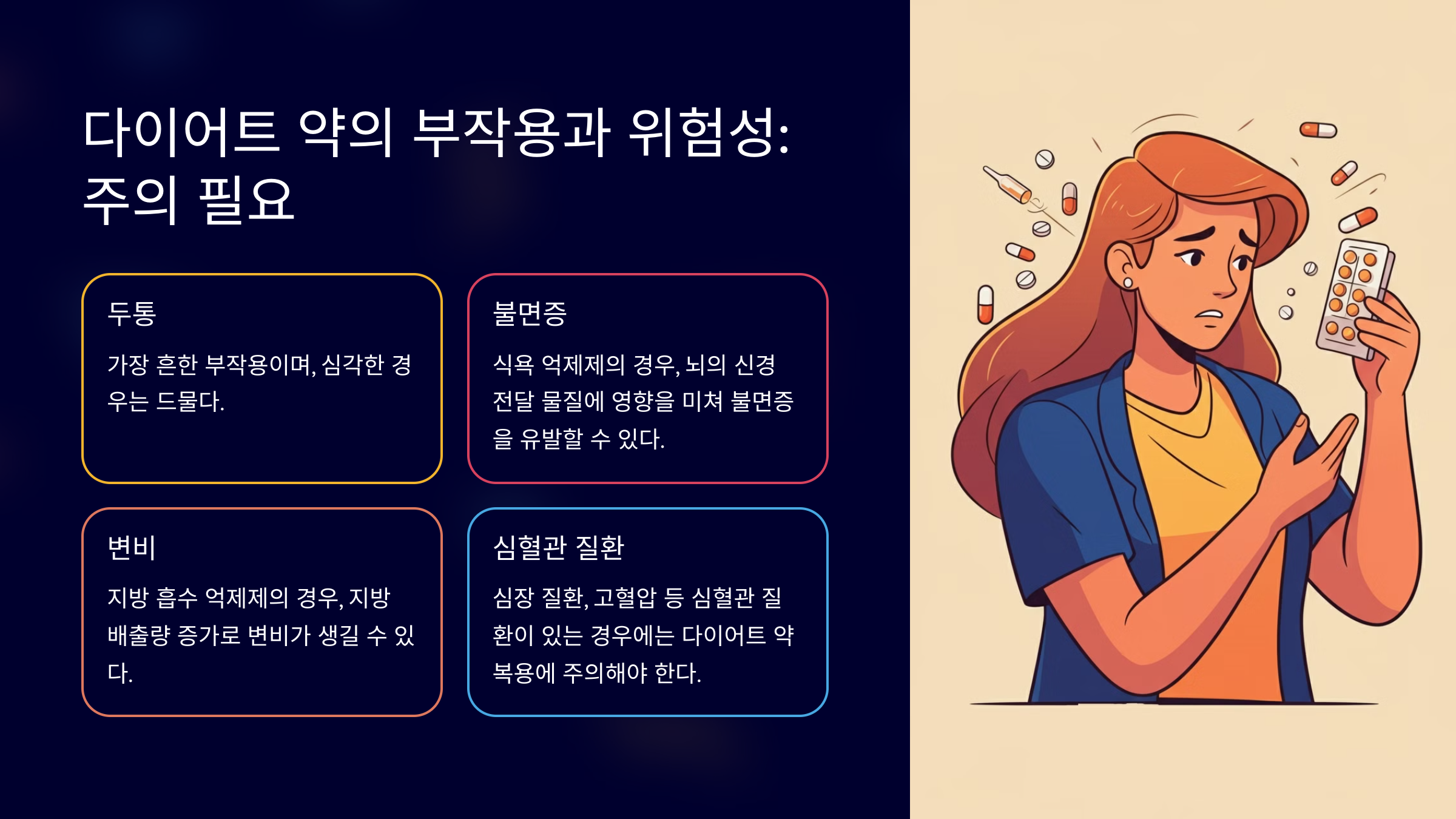 다이어트 약은 올바르게 사용하면 체중 감량에 도움이 될 수 있지만, 부작용과 위험성도 무시할 수 없어요. 가장 흔한 부작용으로는 메스꺼움, 두통, 어지러움, 심장 두근거림 등이 있어요. 이는 약물이 신체의 특정 메커니즘에 영향을 미치기 때문에 나타날 수 있는 현상이랍니다.
