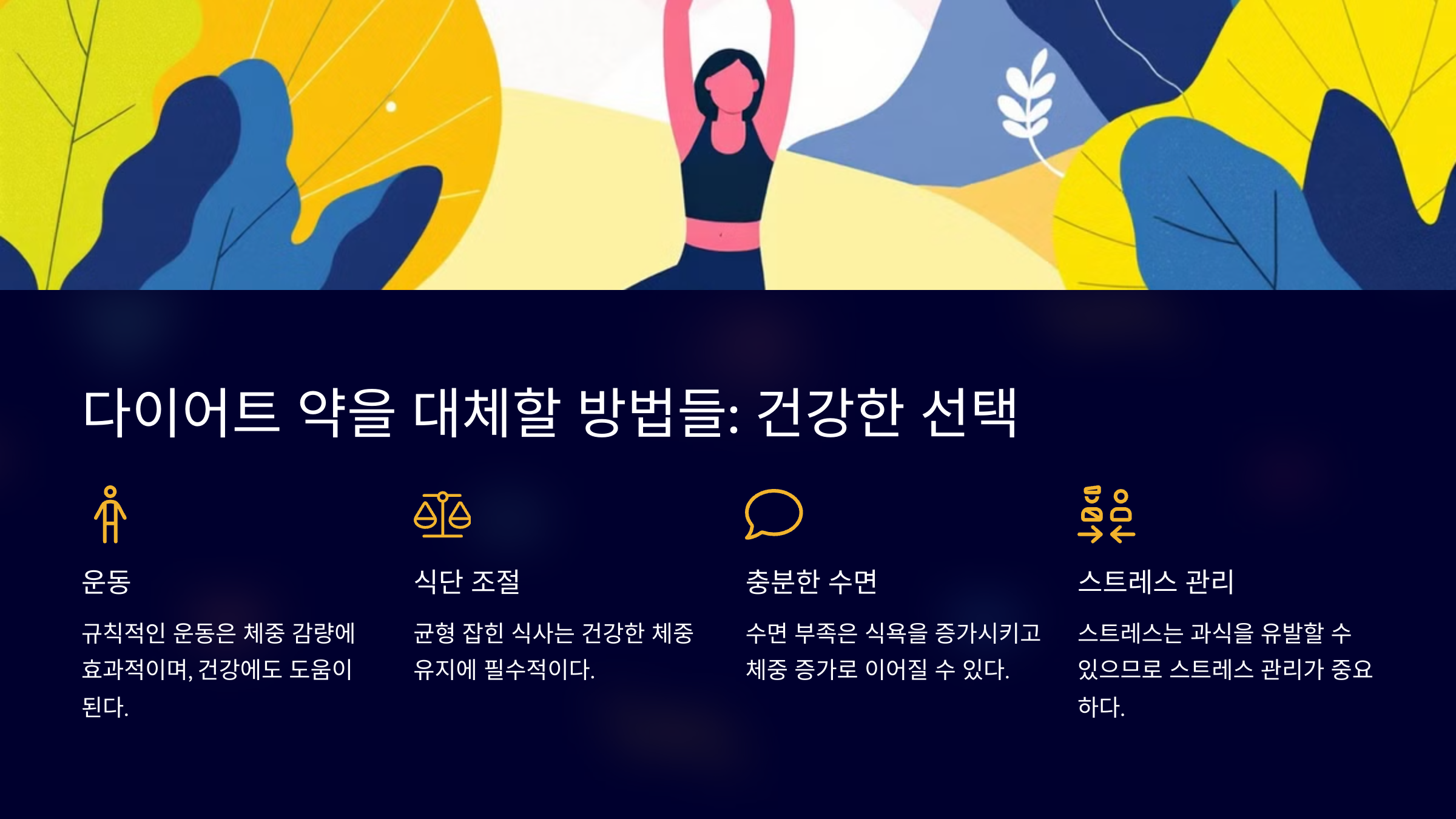 약물에 의존하지 않고도 체중을 감량할 수 있는 대체 방법들은 많아요. 우선, 균형 잡힌 식단과 규칙적인 운동이 다이어트의 기본이에요. 칼로리를 줄이고, 영양소가 풍부한 음식을 섭취하며, 적절한 운동을 병행하는 것이 가장 건강한 방법이죠.