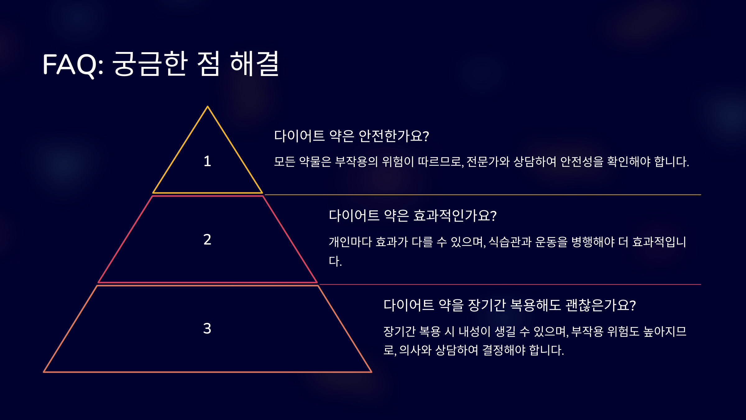 A1. 다이어트 약은 단기적인 체중 감량에 효과를 보일 수 있어요. 하지만 약물에만 의존하는 것은 건강에 좋지 않으며, 식단과 운동을 병행해야 장기적으로 성공할 수 있어요.