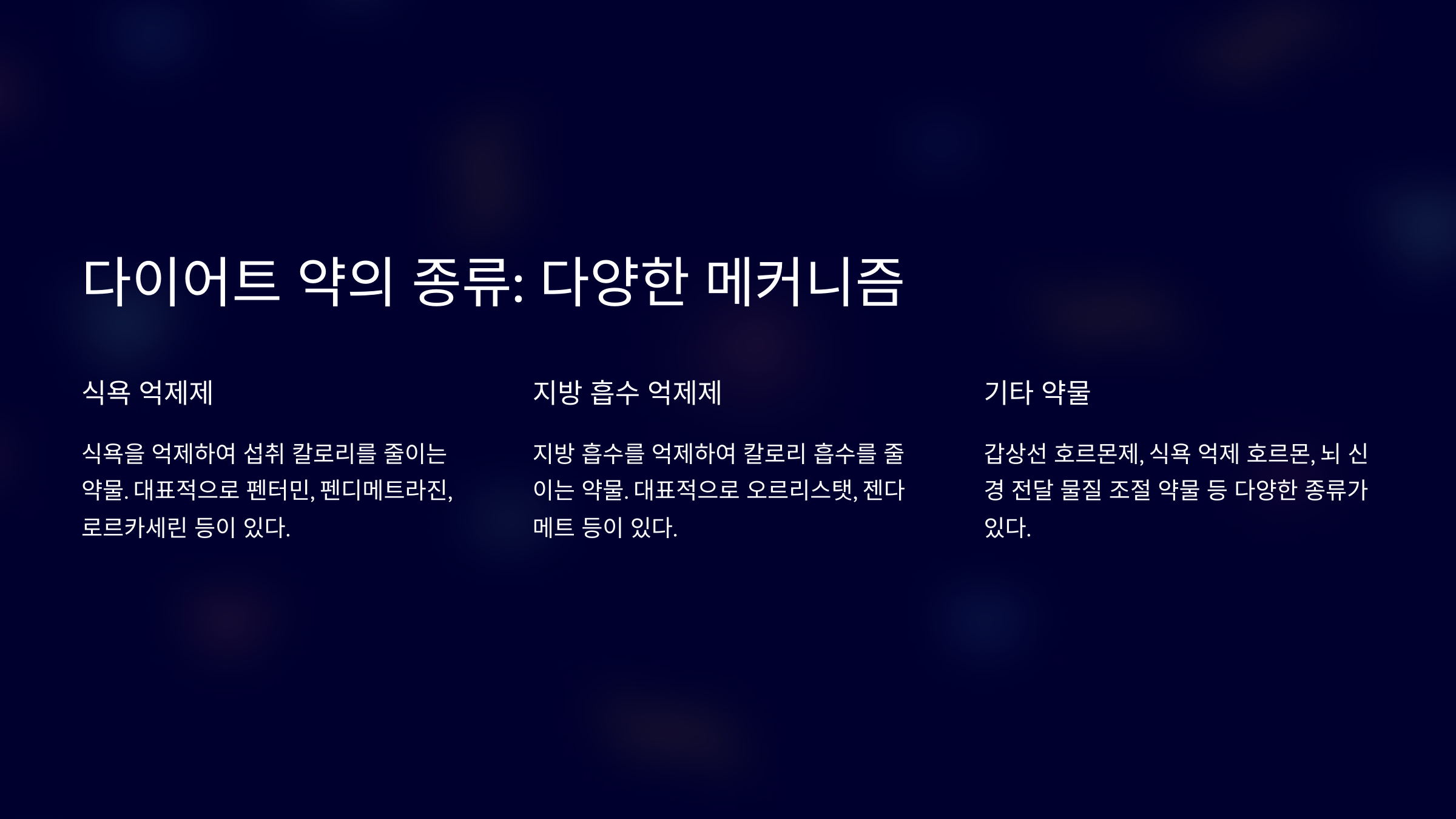 다이어트 약은 다양한 메커니즘을 통해 체중 감량을 도와줘요. 주로 뇌의 시상하부에 있는 식욕 조절 센터에 작용해 배고픔을 억제하거나, 장에서 음식물의 소화와 흡수를 방해하는 방식으로 작동하죠...