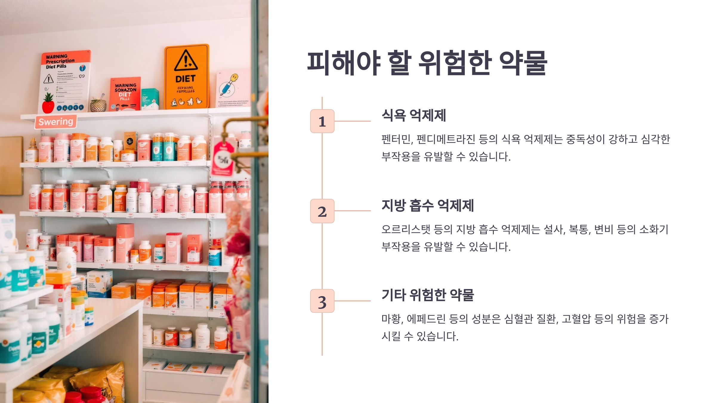 이러한 약물들은 단기간에 체중을 줄일 수 있는 것처럼 보일 수 있지만, 건강을 해칠 가능성이 높아요. 안전한 다이어트를 위해 반드시 의사와 상의하는 것이 중요해요.