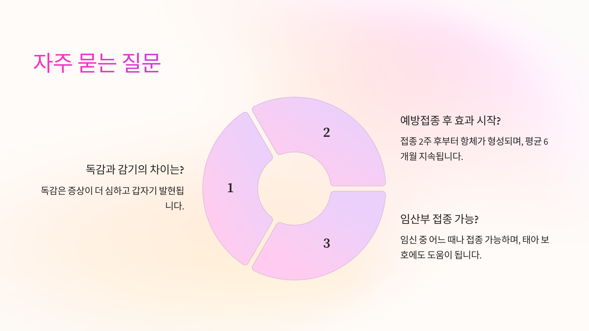 A2. 완벽한 예방은 아니지만, 감염 확률을 낮추고 증상을 경감하는 효과가 있어요.