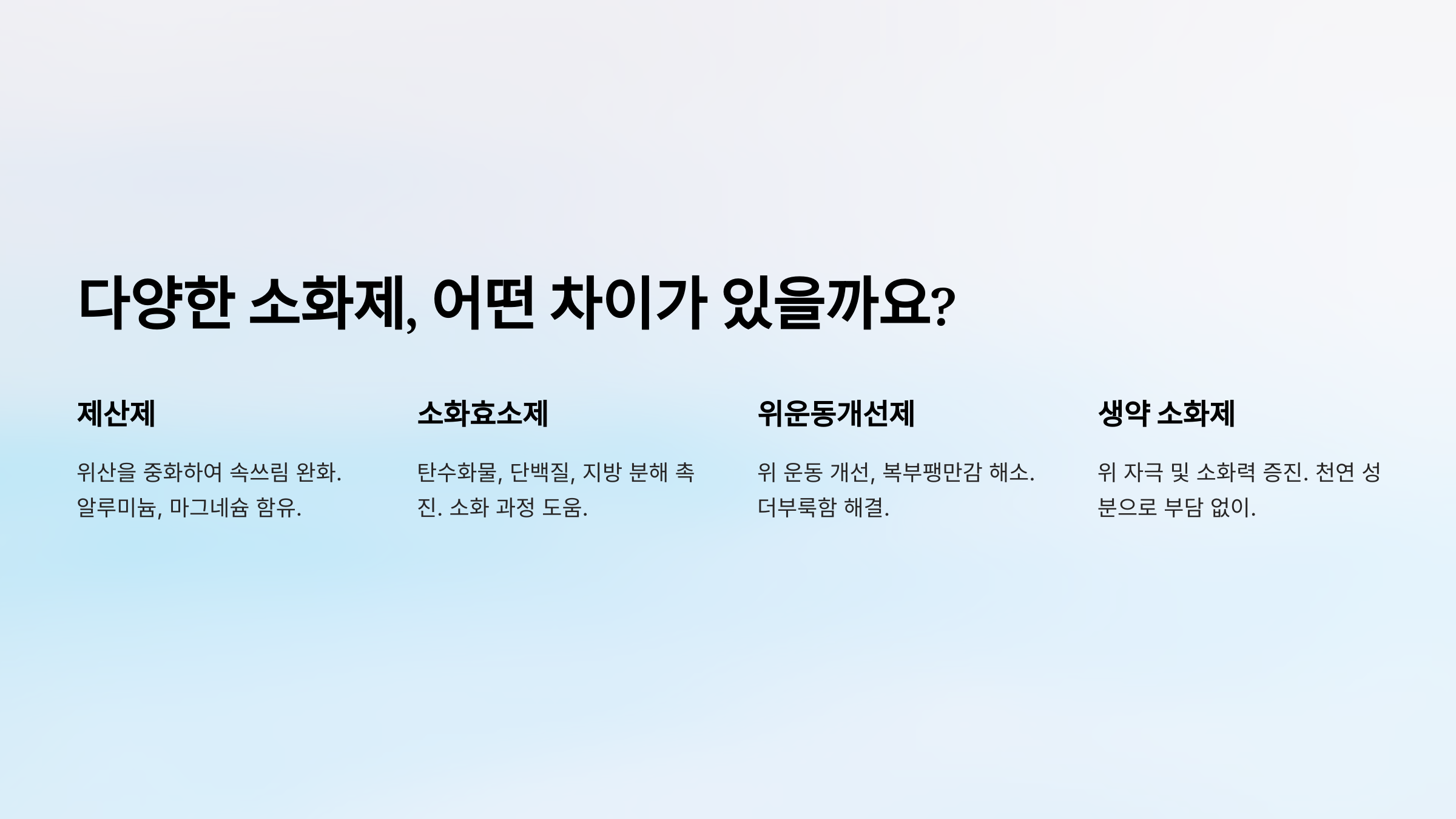 - 증상별 소화제 선택: 단순한 더부룩함인지, 위산 과다 이은 지에 따라 적절한 소화제를 선택해야 해요.