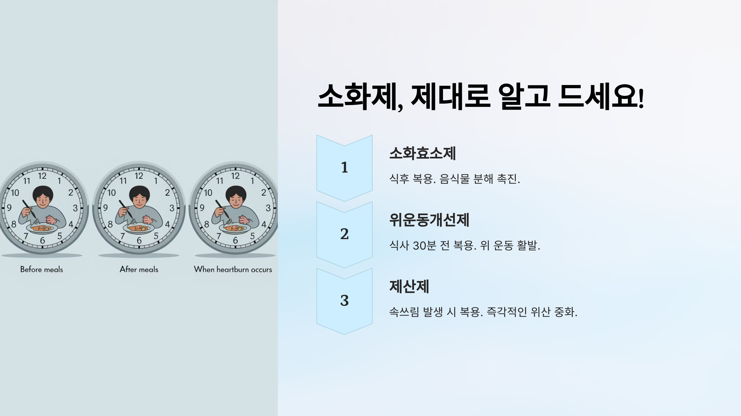 내가 생각했을 때 소화제는 급할 때만 사용하는 응급 설루션이지, 습관적으로 먹으면 안 되는 약이에요. 😊 건강한 식습관이 가장 중요한 점을 기억하세요!