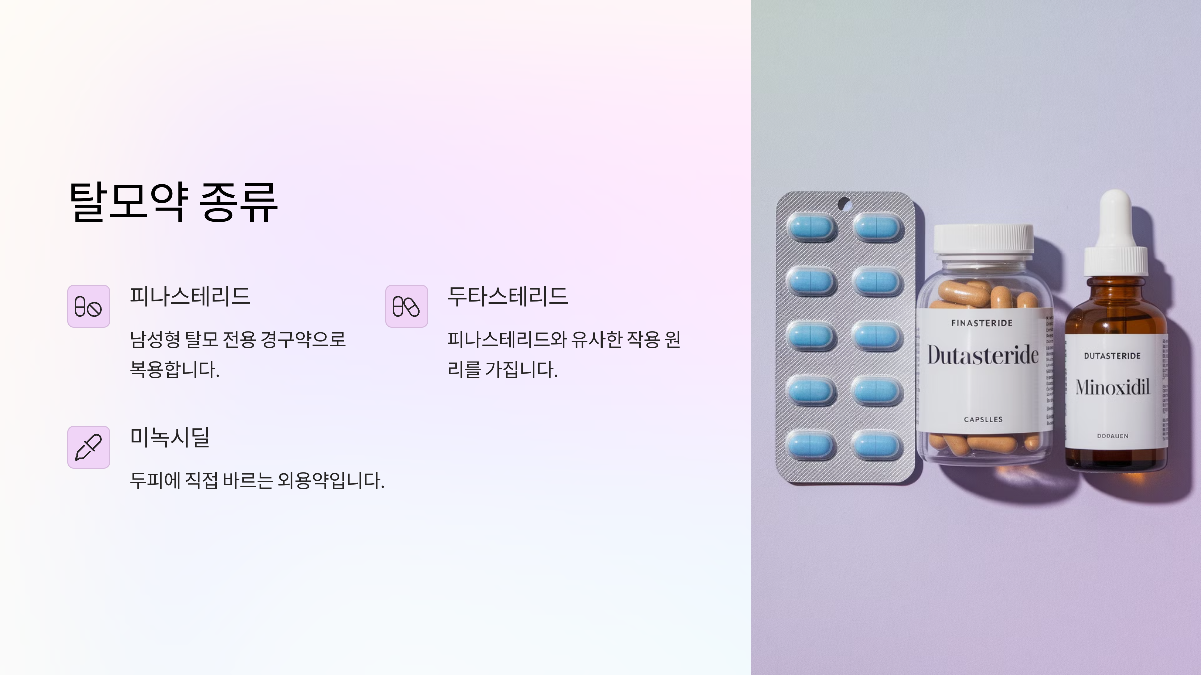 | 프로페시아 | 경구용 | 피나스테리드 | DHT 억제, 탈모 예방 | 7만~9만원(1개월) |