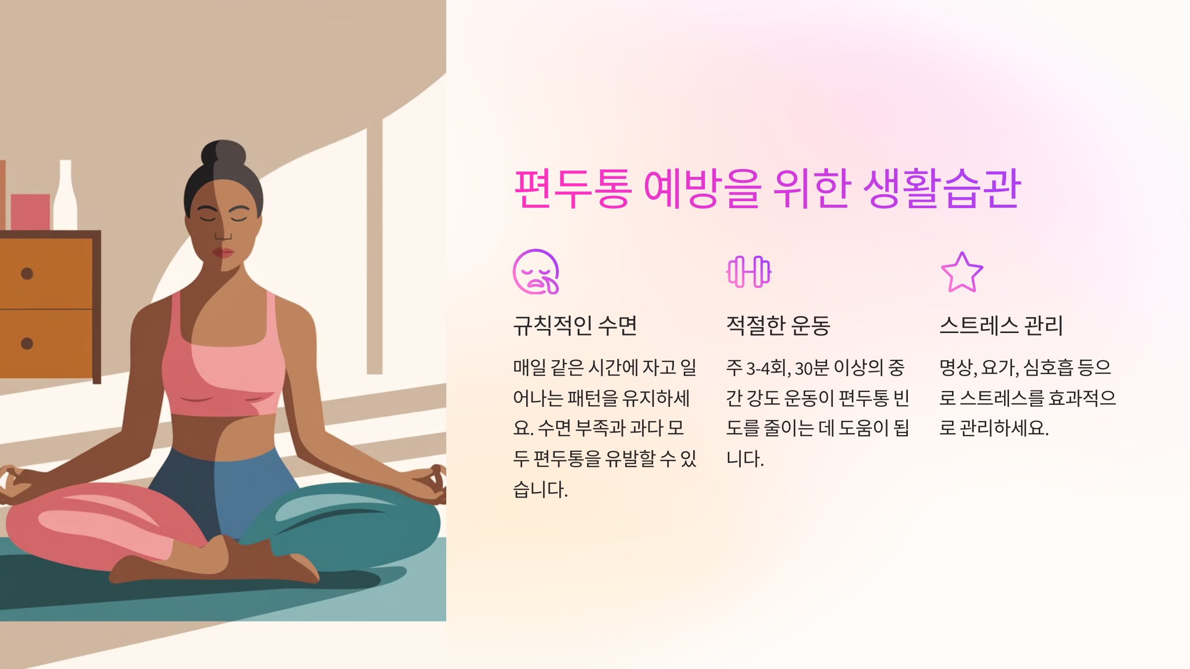 또한, 꾸준한 운동도 편두통 예방에 효과적이에요. 하지만 갑자기 강도 높은 운동을 하면 오히려 두통이 생길 수 있으니, 걷기나 요가처럼 가벼운 운동부터 시작하는 것이 좋아요.