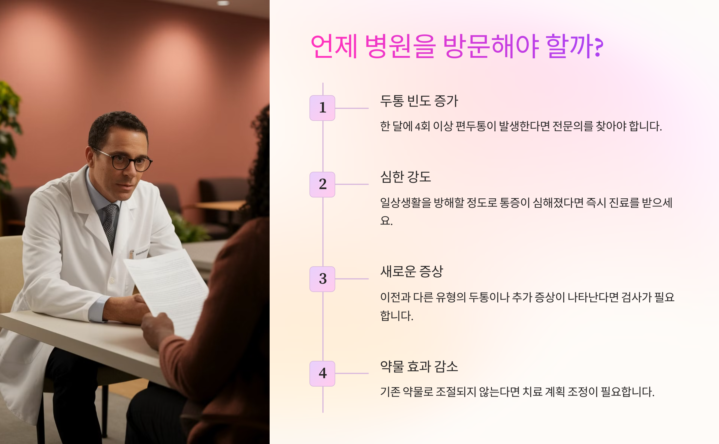 하지만 만약 생활 습관을 개선하고 약물 치료를 해도 편두통이 심하다면, 전문의를 찾아 정확한 진단을 받는 것이 중요해요. 다음 섹션에서 언제 병원을 찾아야 하는지 알아볼까요? 🏥
