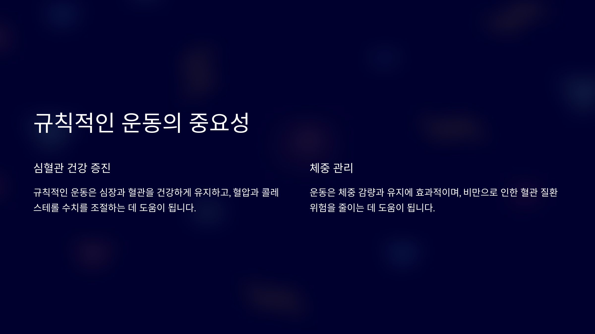 운동은 혈관 건강뿐만 아니라 전체적인 건강에도 긍정적인 영향을 미칩니다.
