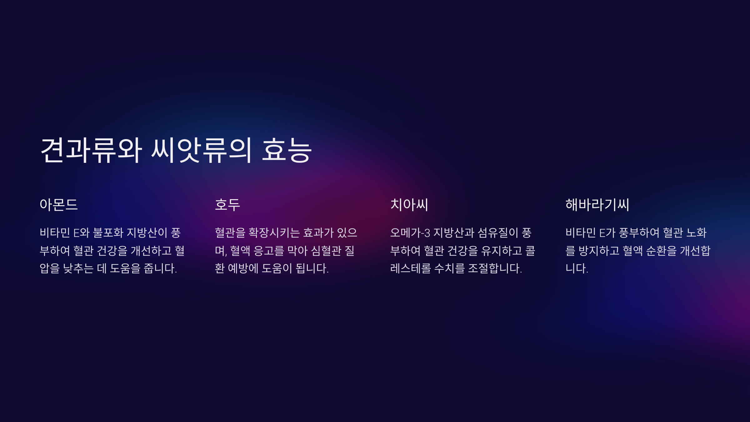 견과류와 씨앗류는 혈관 건강을 위한 탁월한 선택이에요. 특히 호두는 오메가-3 지방산이 풍부해서 염증을 줄이고 동맥의 탄력성을 높이는 데 효과적이에요. 하루 한 줌의 호두를 섭취하면 심혈관 질환 위험을 낮추는 데 도움이 된답니다.