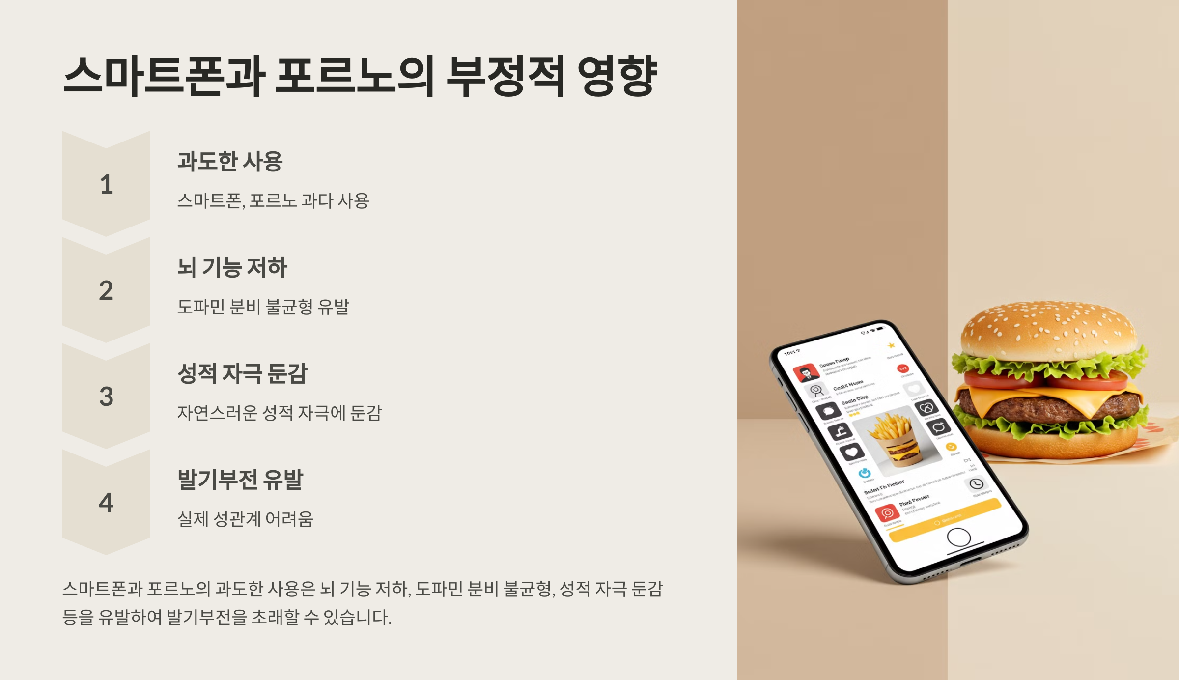 마지막으로 스마트폰 사용과 디지털 의존도 증가도 문제예요. 스마트폰을 과도하게 사용하면 뇌의 보상 시스템이 변화하면서 성적인 자극에 대한 반응이 둔해질 수 있어요. 또한, 포르노를 자주 시청할 경우 현실적인 성적 자극에 대한 반응이 약해질 위험이 커요.