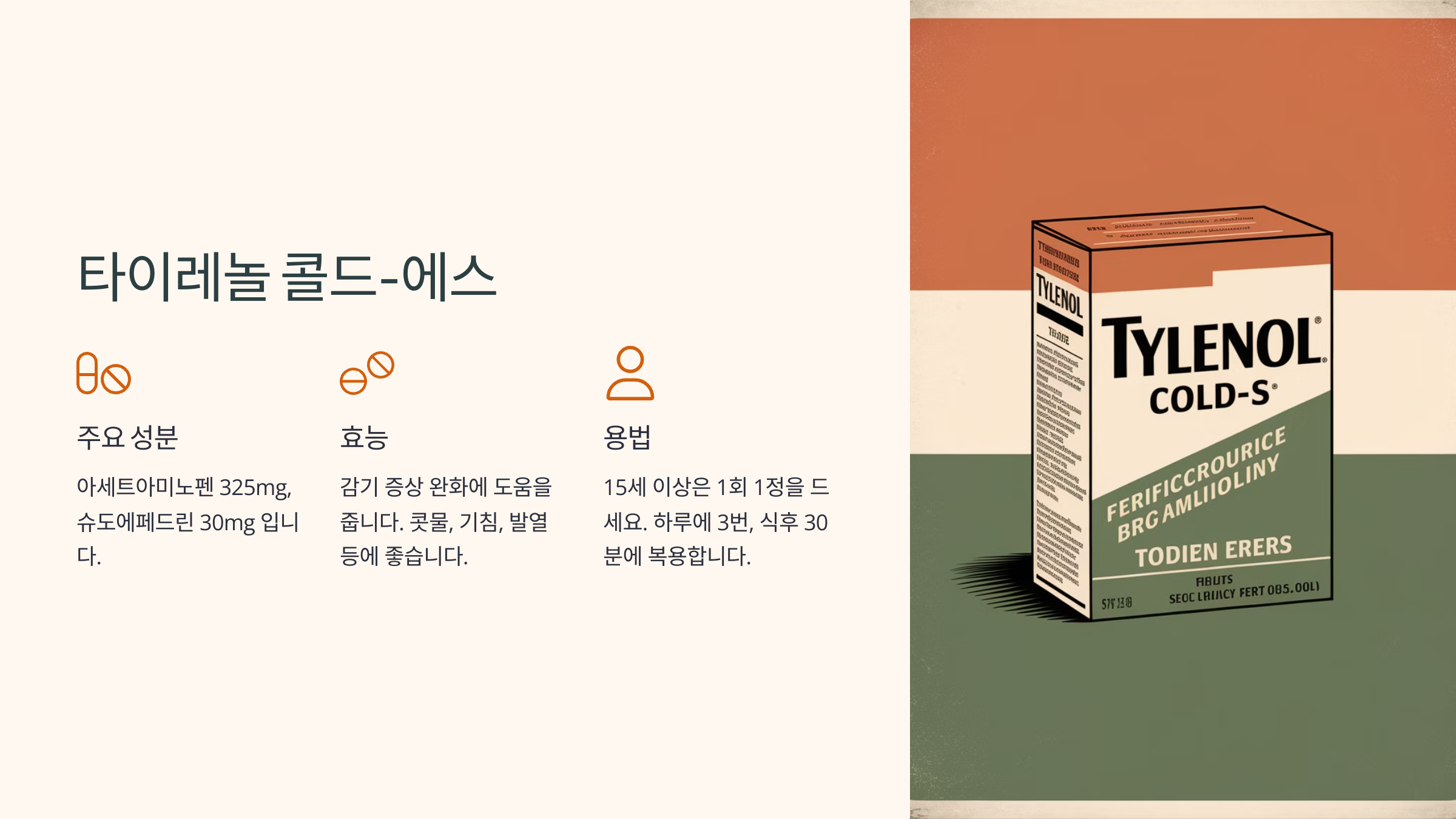 | 타이레놀 콜드-센스 | 아세트아미노펜 | 발열, 두통 완화 | 열이 나는 분 |