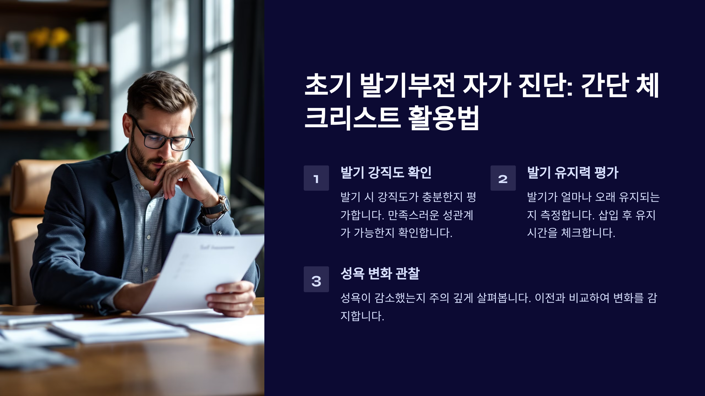 발기부전은 초기 단계에서 발견하면 생활 습관 개선만으로도 충분히 회복할 수 있어요. 아래 자가 진단 체크리스트를 통해 현재 상태를 점검해 보세요.