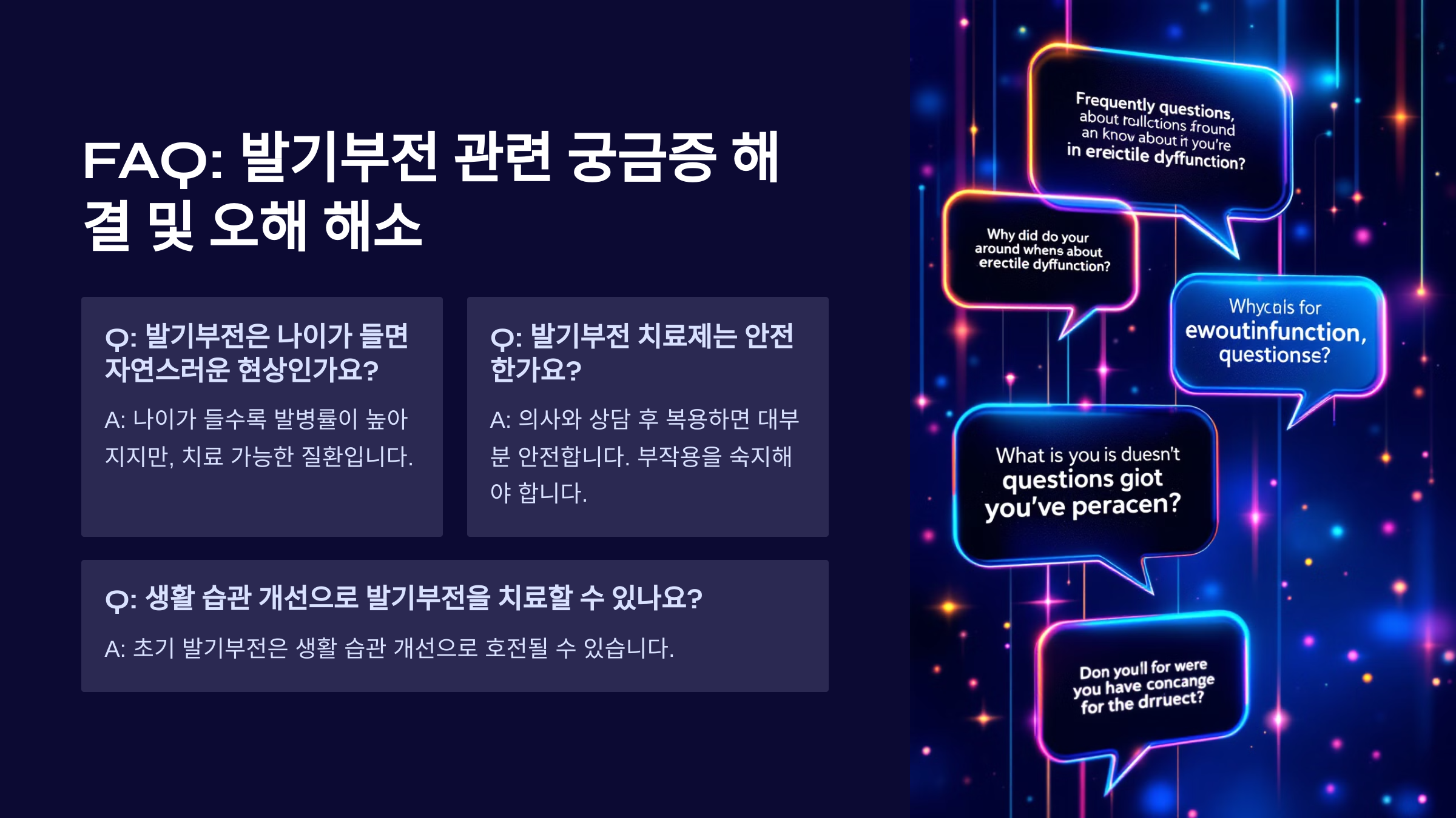 운동과 식습관을 개선하면 발기력 향상뿐만 아니라 전반적인 건강도 좋아질 수 있어요! 💪 이제 발기부전에 대한 자주 묻는 질문을 살펴볼까요? ❓