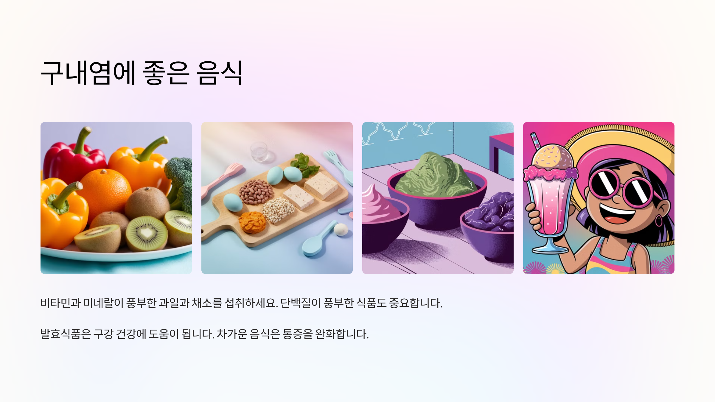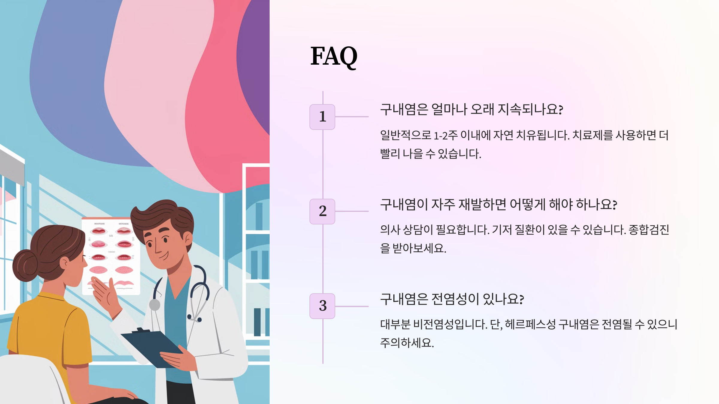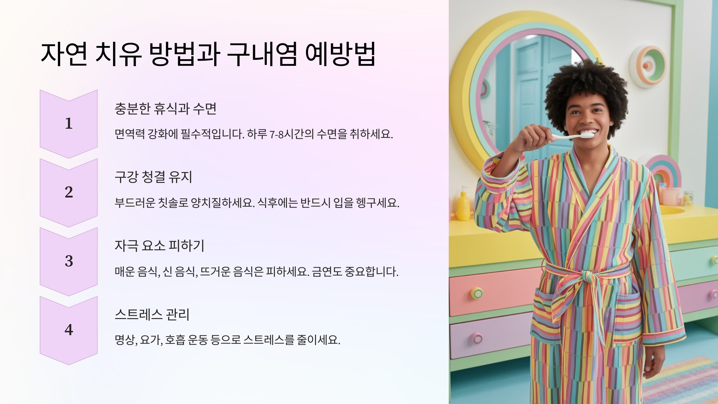 ✔ 유산균 섭취: 프로바이오틱스가 포함된 요구르트나 김치를 먹으면 구강 내 유익균이 증가해 회복이 빨라질 수 있어요.