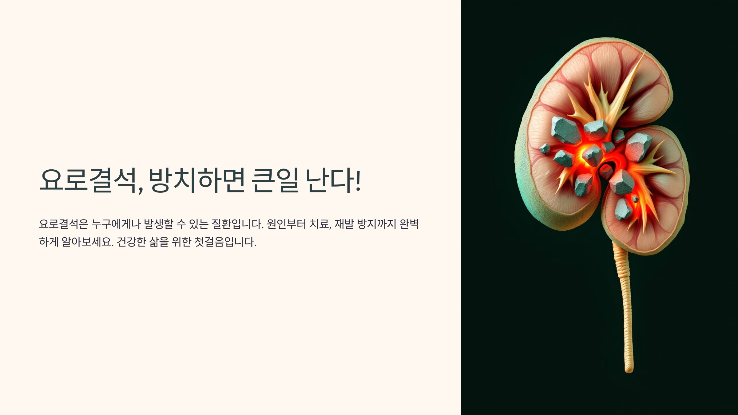 요로결석은 신장, 요관, 방광, 요도에 형성되는 단단한 결석으로 극심한 통증을 유발하는 질환이에요. 특히 남성에게 많이 발생하며, 수분 섭취 부족, 잘못된 식습관, 유전적 요인 등이 주요 원인으로 작용해요.