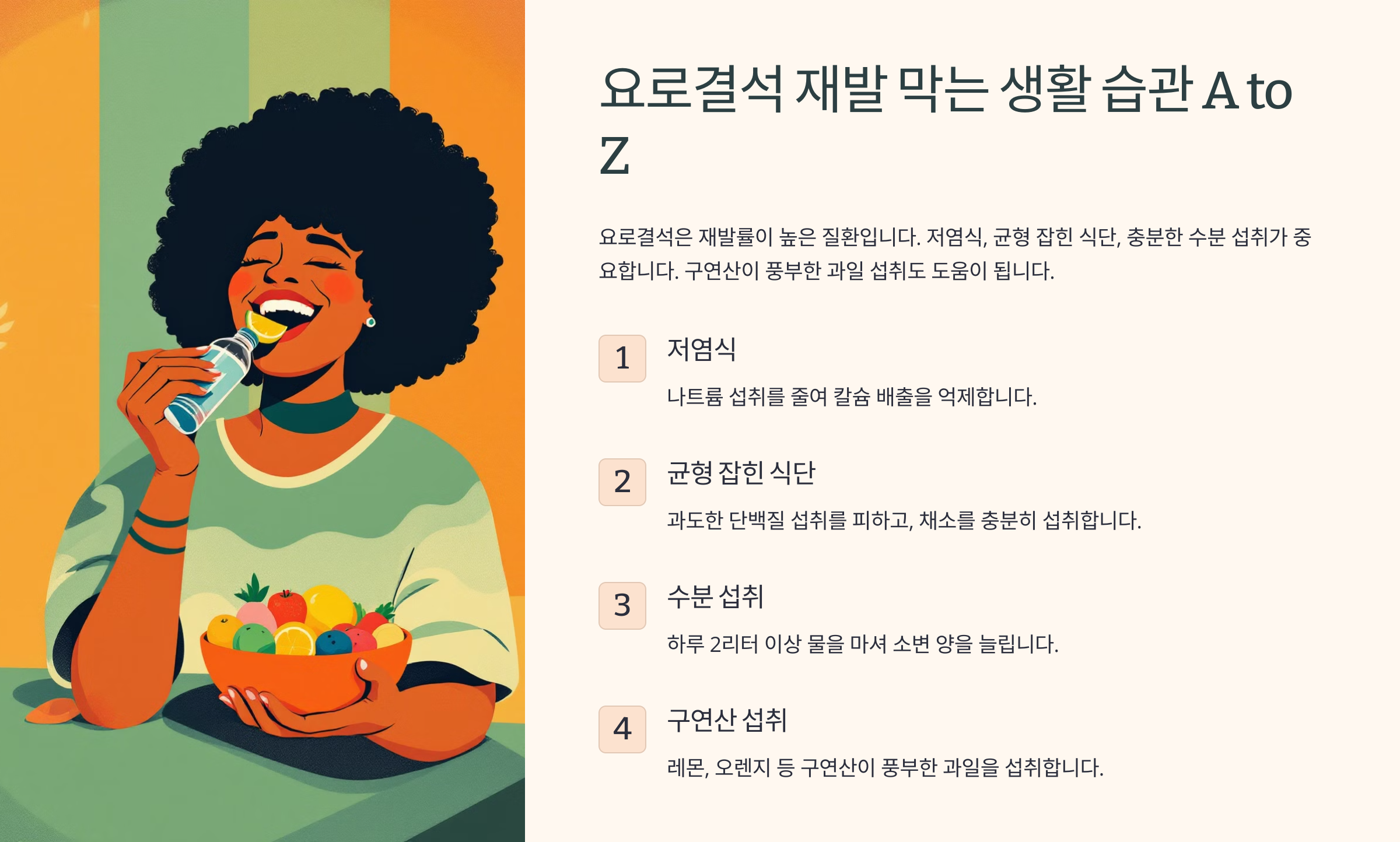 식단 조절만 잘해도 요로결석 예방에 큰 도움이 될 수 있어요! 🥗