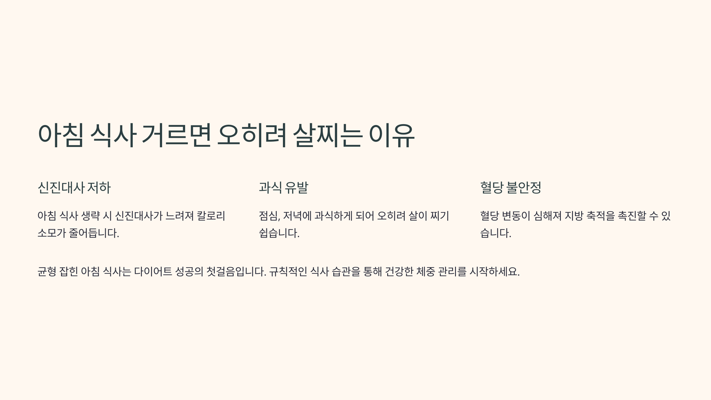 | 아침 거르기 | 대사율 저하, 폭식 유발 | 단백질과 식이섬유 포함한 간단한 아침 식사 |