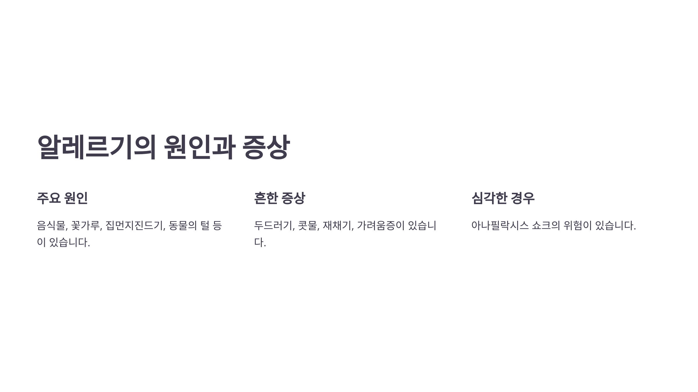 | 알레르기 원인 | 주요 증상 | 주의할 점 |