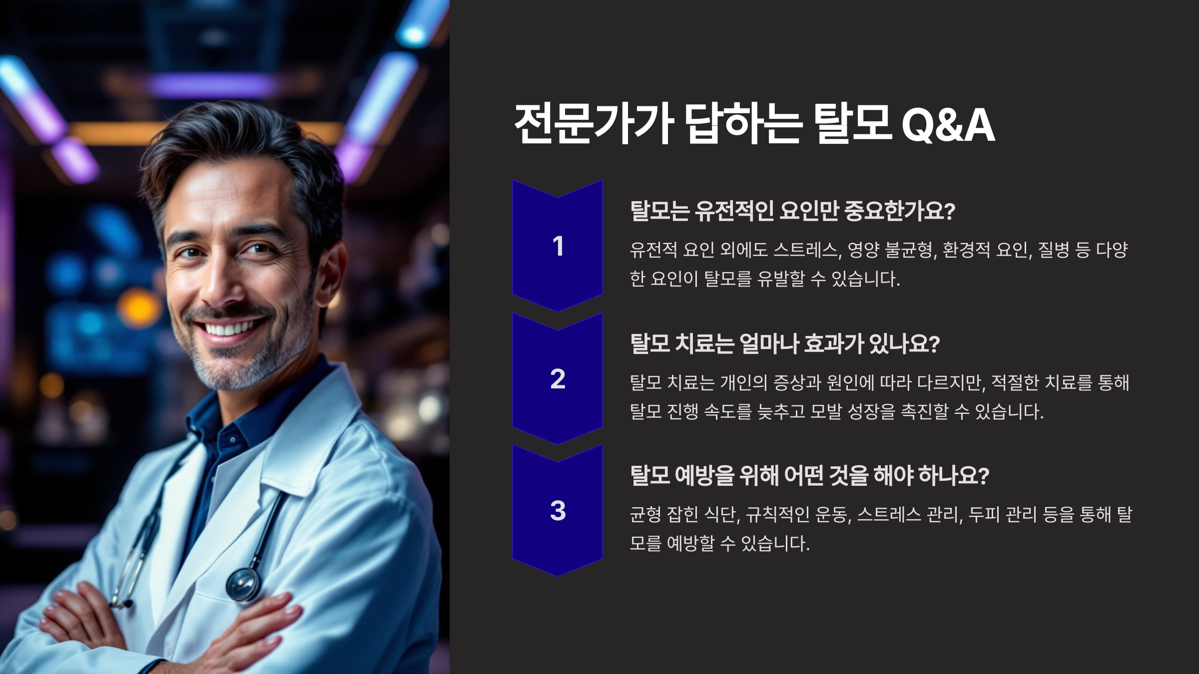 | 모발 이식 | 영구적 해결, 자연스러운 모발 | 고비용, 회복 시간 필요 |