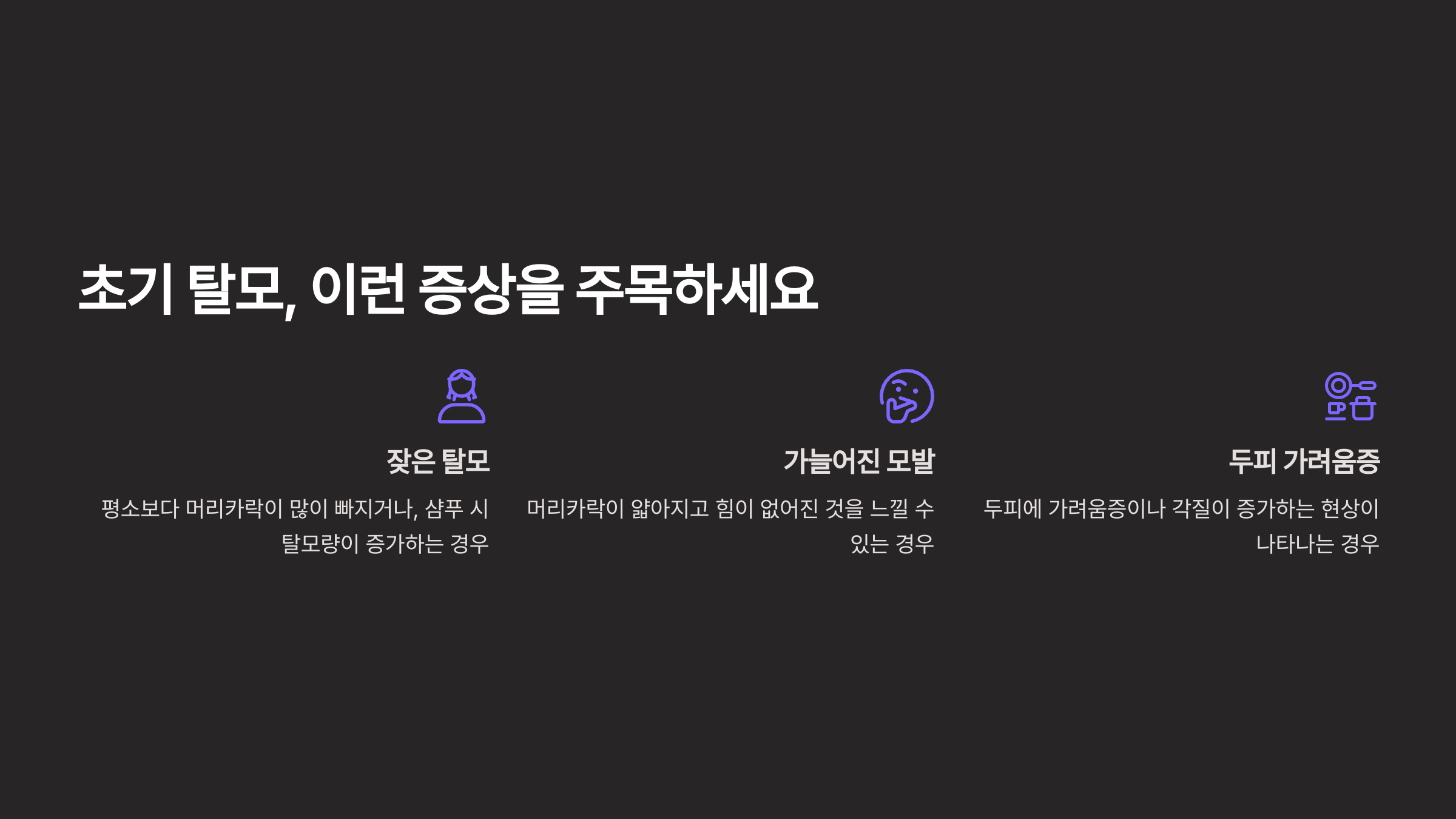 | 모발 변화 | 가늘어지다 빠짐 | 전체적으로 얇아짐 |