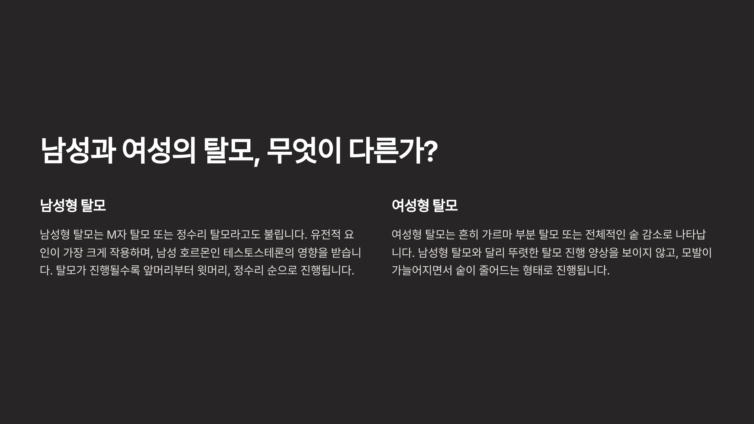 | 탈모 부위 | M자형, 정수리 | 정수리 중심 |